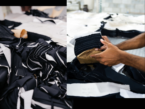 ● UPC com reuso de tecidos chamados “pontas de rolo”: sobras de rolos de tecidos, materiais que não foram usados em produções industriais e ficariam esquecidos, perdendo valor, ou seriam descartados. Pra trabalhar com essas pontas, aplicamos uma engenharia de aproveitamento, valorizando o material na criação de poucas peças, quase exclusivas, e com a inteligência de otimizar o recurso gerando o menor desperdício possível. Uma ginástica mental!