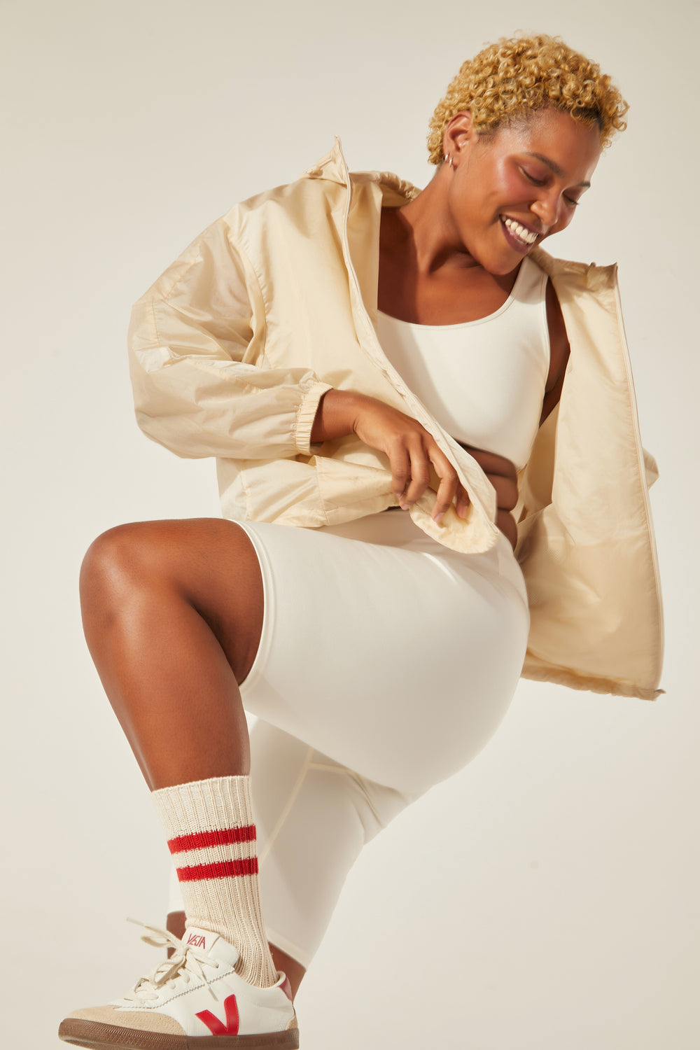 Modo produtivo: reaproveitamento de tecidos maiores, que podem ser rolos fechados ou o que chamamos de “finais de rolo”, sobras da produção industrial de roupas fitness com mais de 5m. Todos materiais que ficariam fora do circuito das grandes marcas e, por serem mara, aqui ganham uma nova oportunidade com o nosso olhar de engenharia de produto que nada descarta e tudo aproveita!
