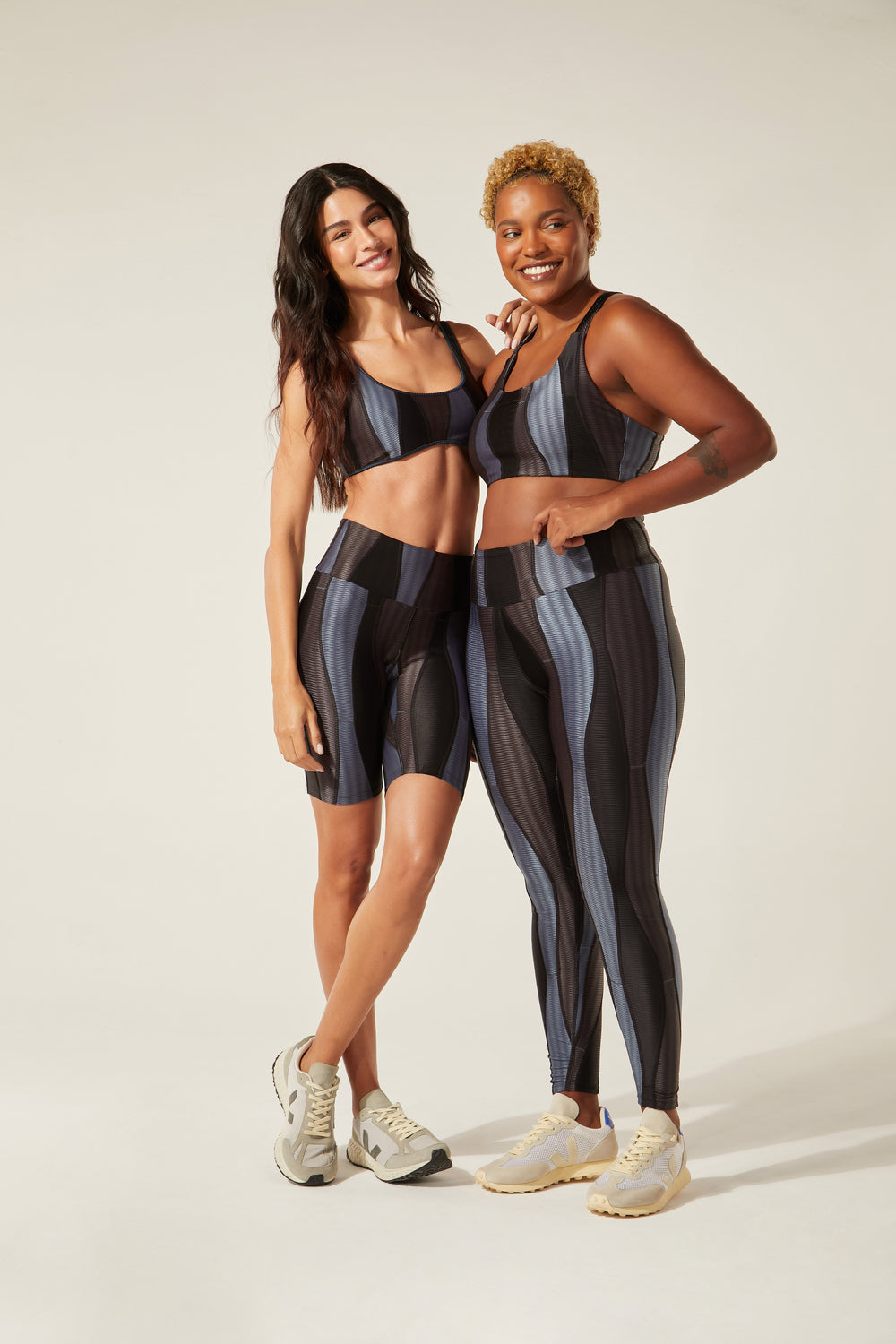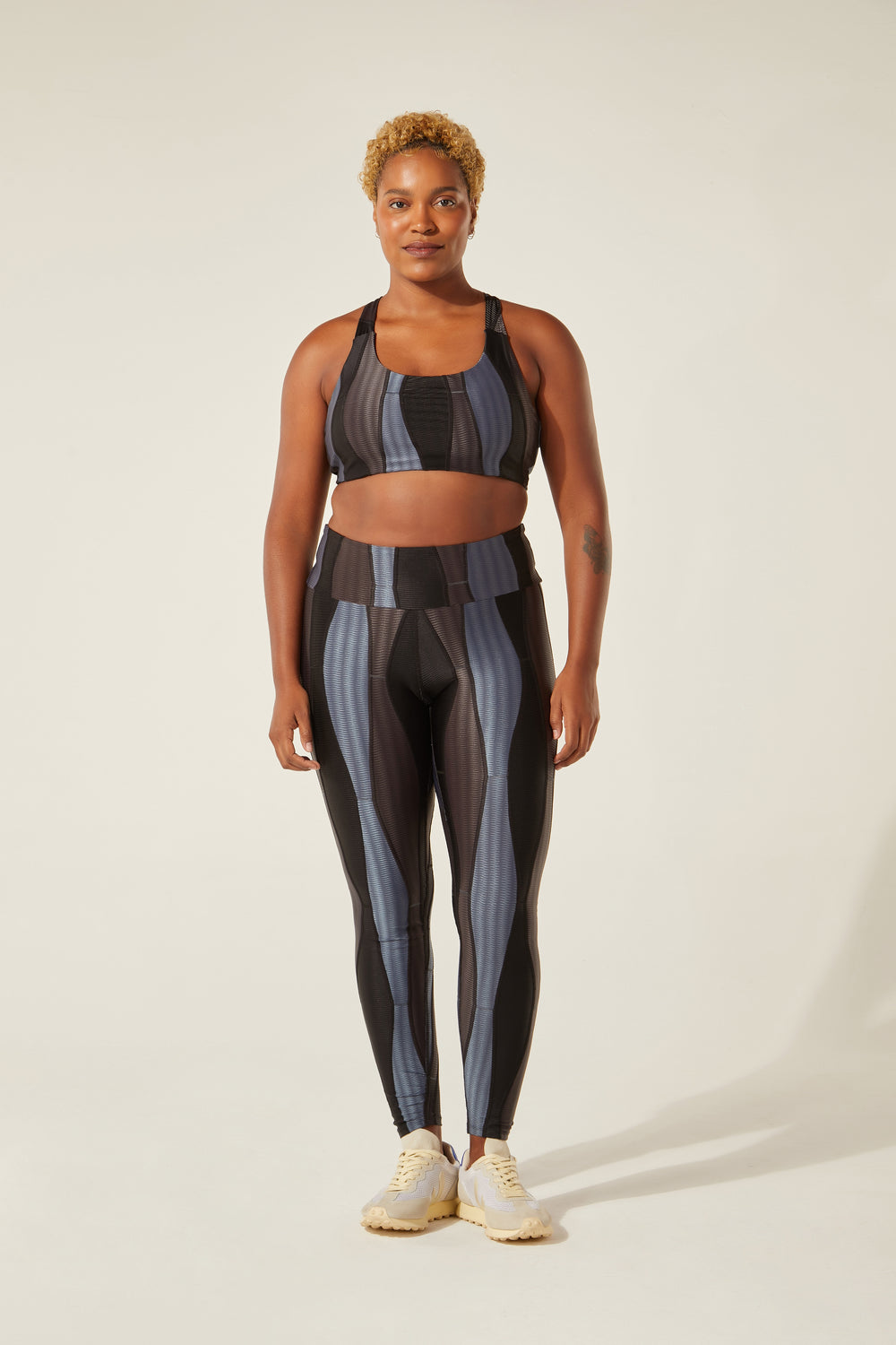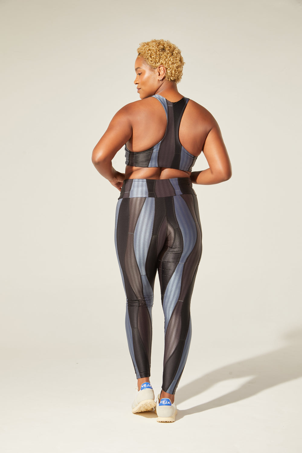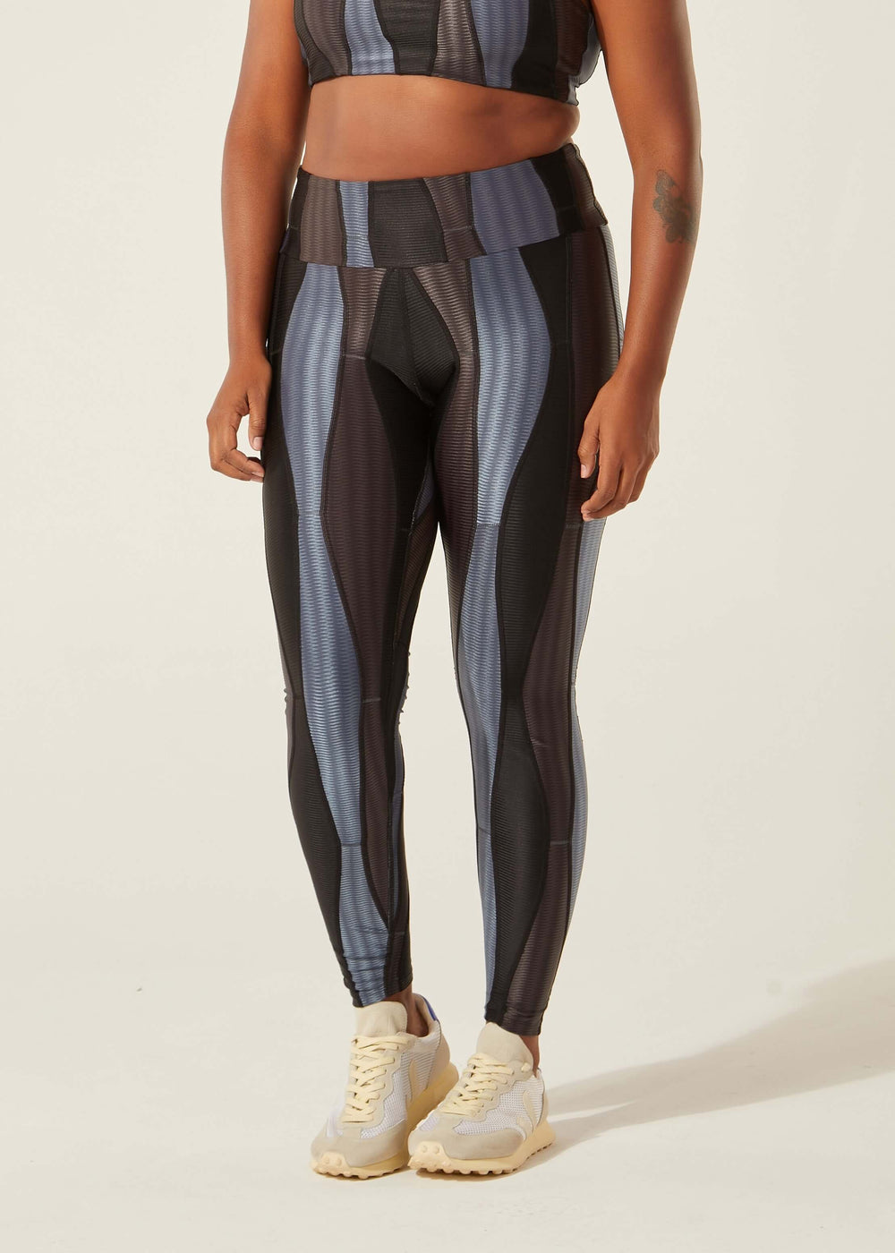 Modo produtivo: UPC (upcycling) com tecido ORICLA ELÁSTICO. Retalhos sobrantes e selecionados de grandes produções da moda fitness são transformados em novos rolos de tecido com costuras tecnológicas que não marcam a pele. Cada criação nasce de um processo intenso que envolve técnica, sensibilidade e muita criatividade! No upcycling, o investimento é humano — está no tempo e na habilidade de quem costura, e não em tecidos novos. ORICLA ELÁSTICO, desenvolvido em parceria entre a Confecções T.Christina e a designer Agustina Comas, foi premiado pelo Fashion Futures 2021 na categoria Inovação e Tecnologia.
