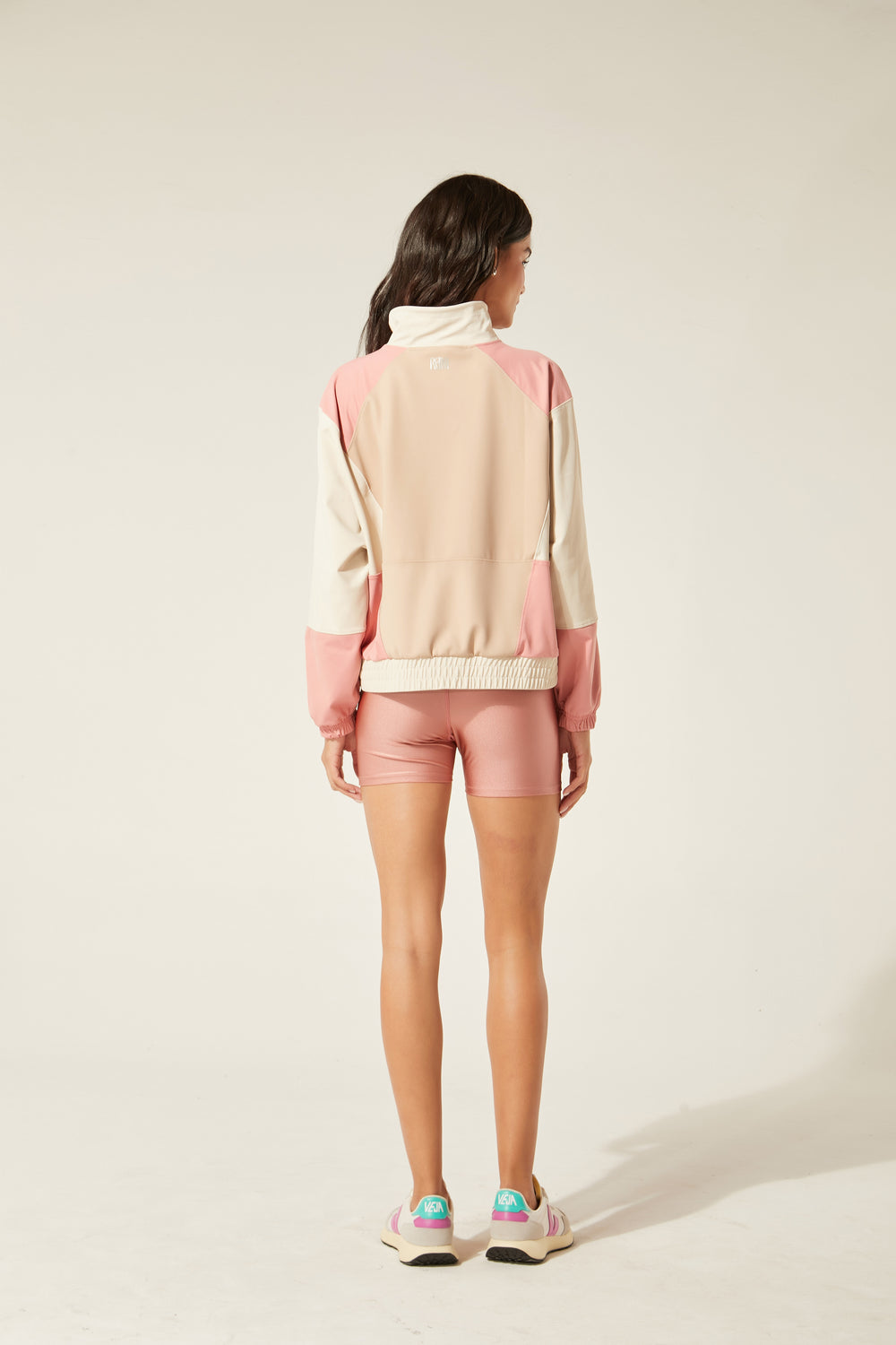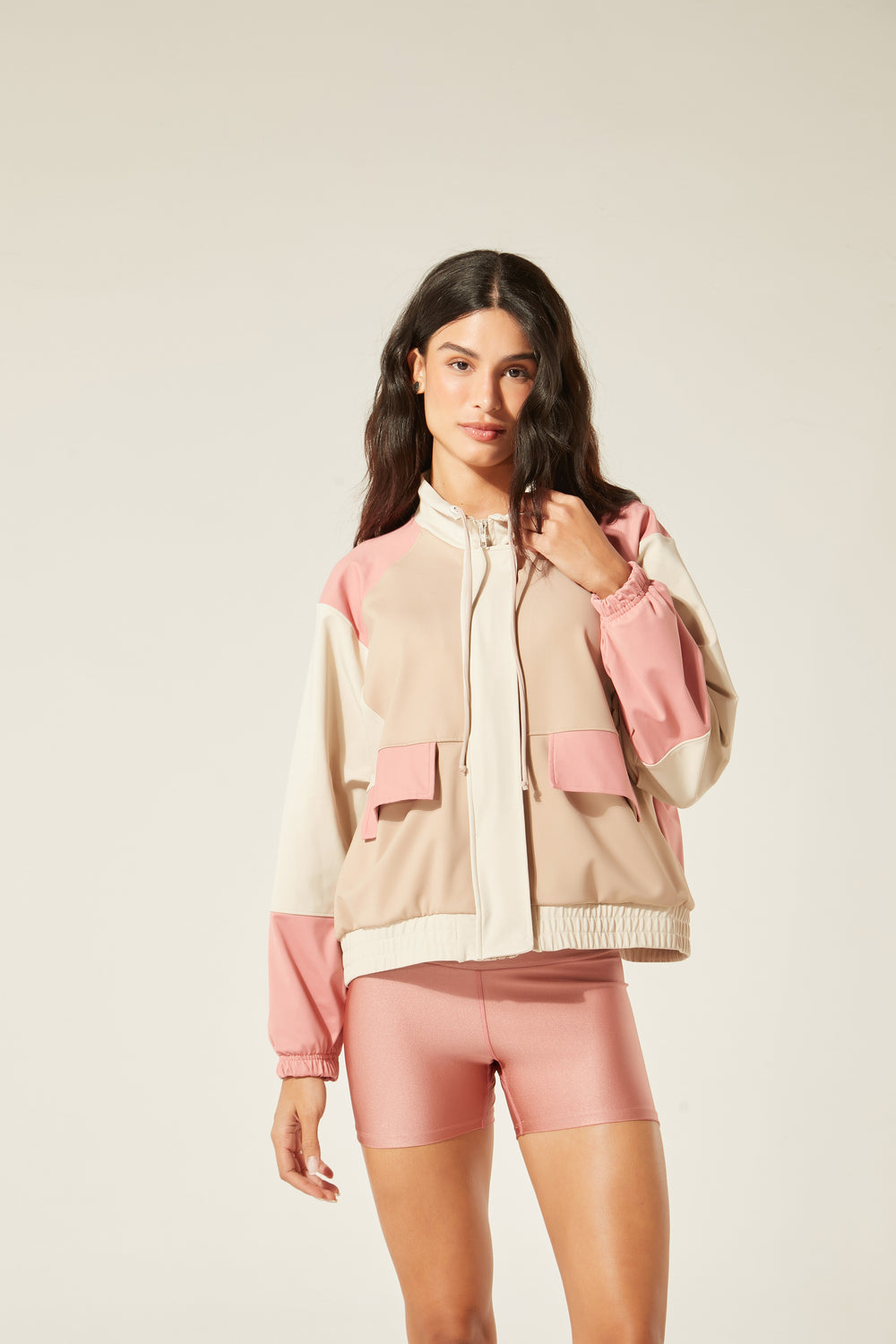 Nossa jaqueta é mais do que um corta-vento, é um casaquinho leve, perfeito pra meia-estação ou pras primeiras horas da manhã. Tem bolsos frontais, zíper trator, pra facilitar o abre e fecha, e pequenos charmes. O cadarço da gola, que você pode usar fechada ou aberta, e os elásticos nas mangas fortalecem o styling. E a cereja do bolo: os recortes de tecidos diferentes em cores que amamos são o resultado da nossa ginástica mental para valorizar materiais sobrantes e selecionados. Detalhe do detalhe: a dança das cores também nas linhas do pesponto combinando com cada recorte. É loka!