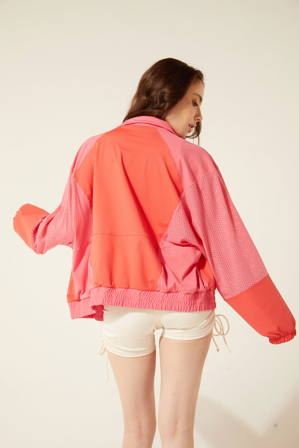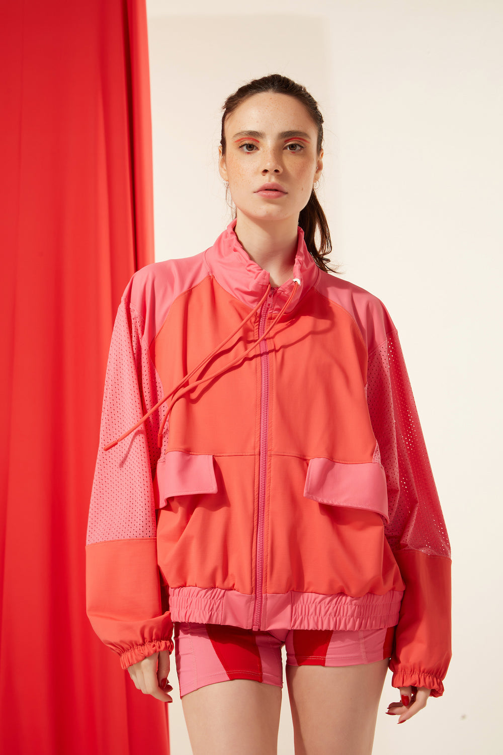Nossa jaqueta é mais do que um corta-vento, é um casaquinho leve, perfeito pra meia-estação ou pras primeiras horas da manhã. Tem bolsos frontais, zíper trator, pra facilitar o abre e fecha, e pequenos charmes. O cadarço da gola, que você pode usar fechada ou aberta, e os elásticos nas mangas fortalecem o styling. E a cereja do bolo: os recortes de tecidos diferentes em cores que amamos são o resultado da nossa ginástica mental para valorizar materiais sobrantes e selecionados. Detalhe do detalhe: a dança das cores também nas linhas do pesponto combinando com cada recorte. É loka!