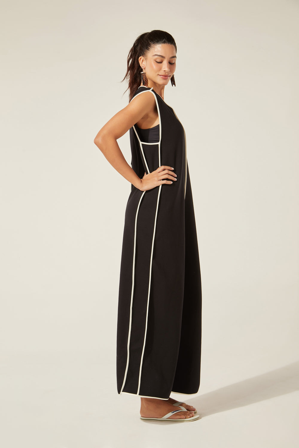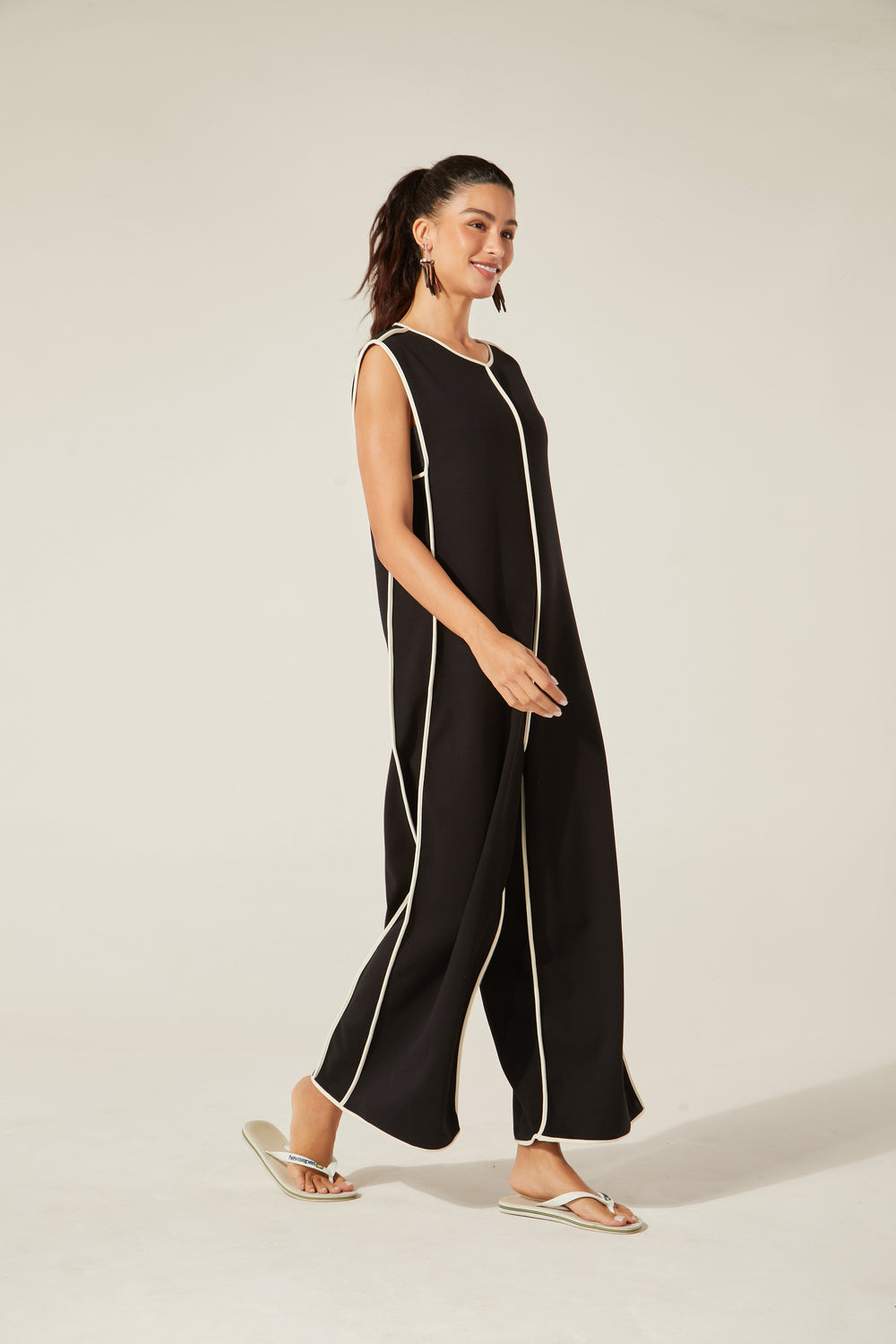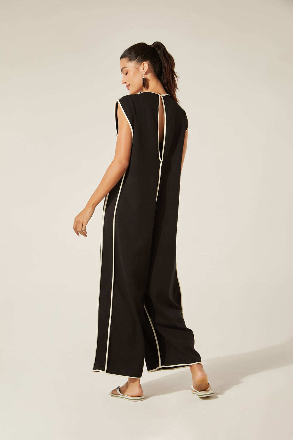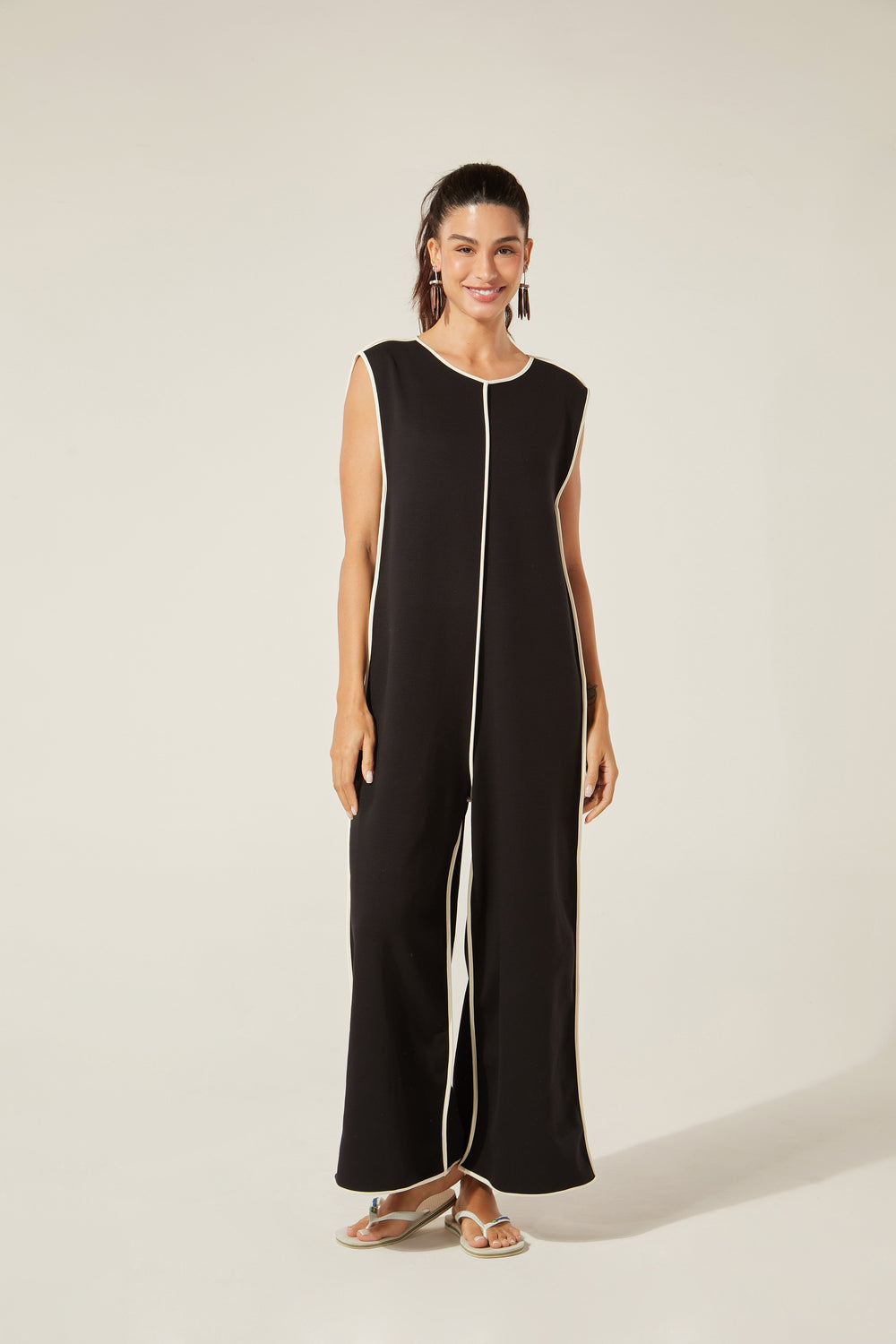 Modelagem ampla, gostosa, cool, é perfeita pra viver! O tecido não amassa, o contraste clássico do preto com o branco nos detalhes da peça traz desenho para o movimento do corpo. O fecho atrás com botão do nosso acervo arremata um lookão de uma peça só ou com os nossos tops por baixo.