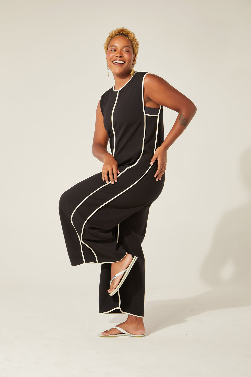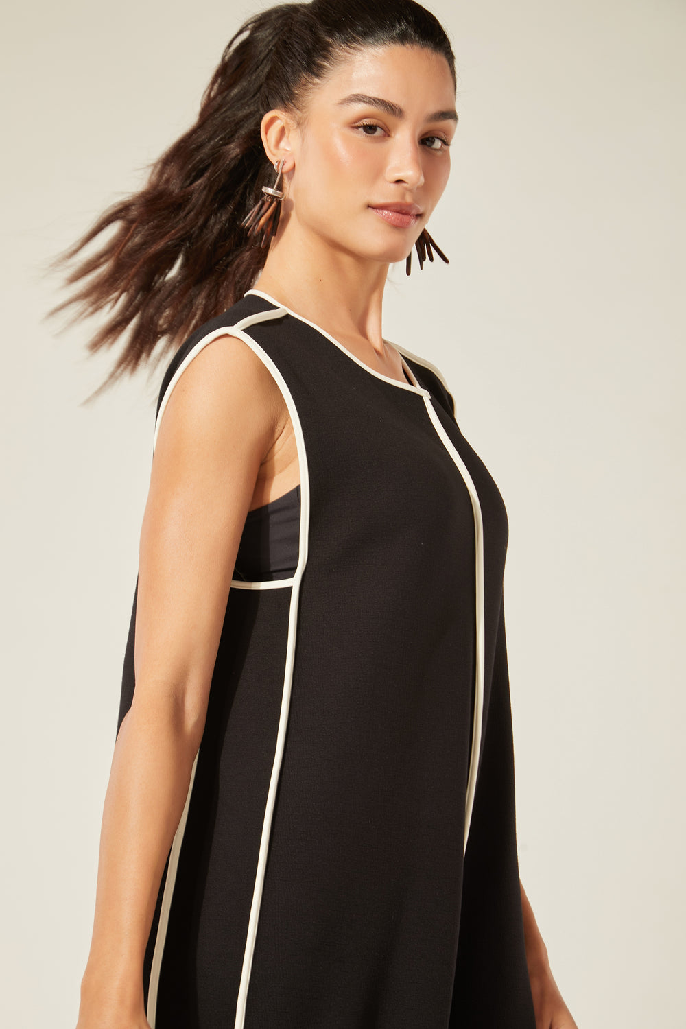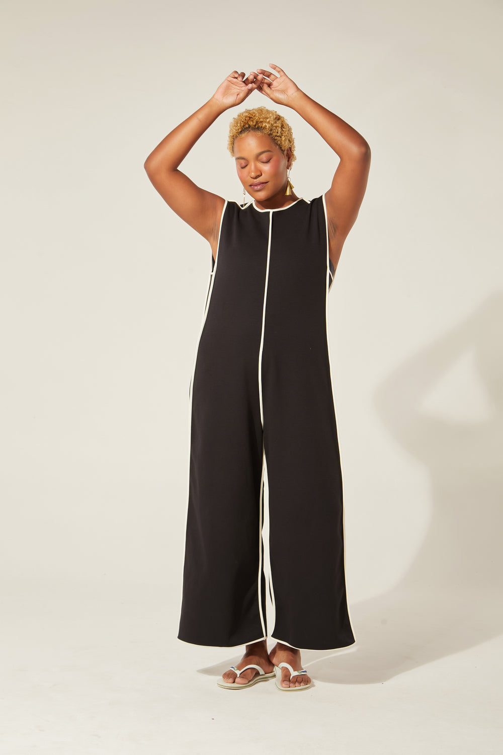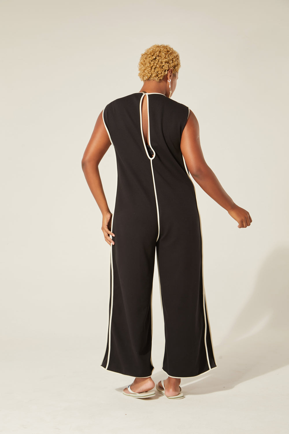 Modelagem ampla, gostosa, cool, é perfeita pra viver! O tecido não amassa, o contraste clássico do preto com o branco nos detalhes da peça traz desenho para o movimento do corpo. O fecho atrás com botão do nosso acervo arremata um lookão de uma peça só ou com os nossos tops por baixo.
