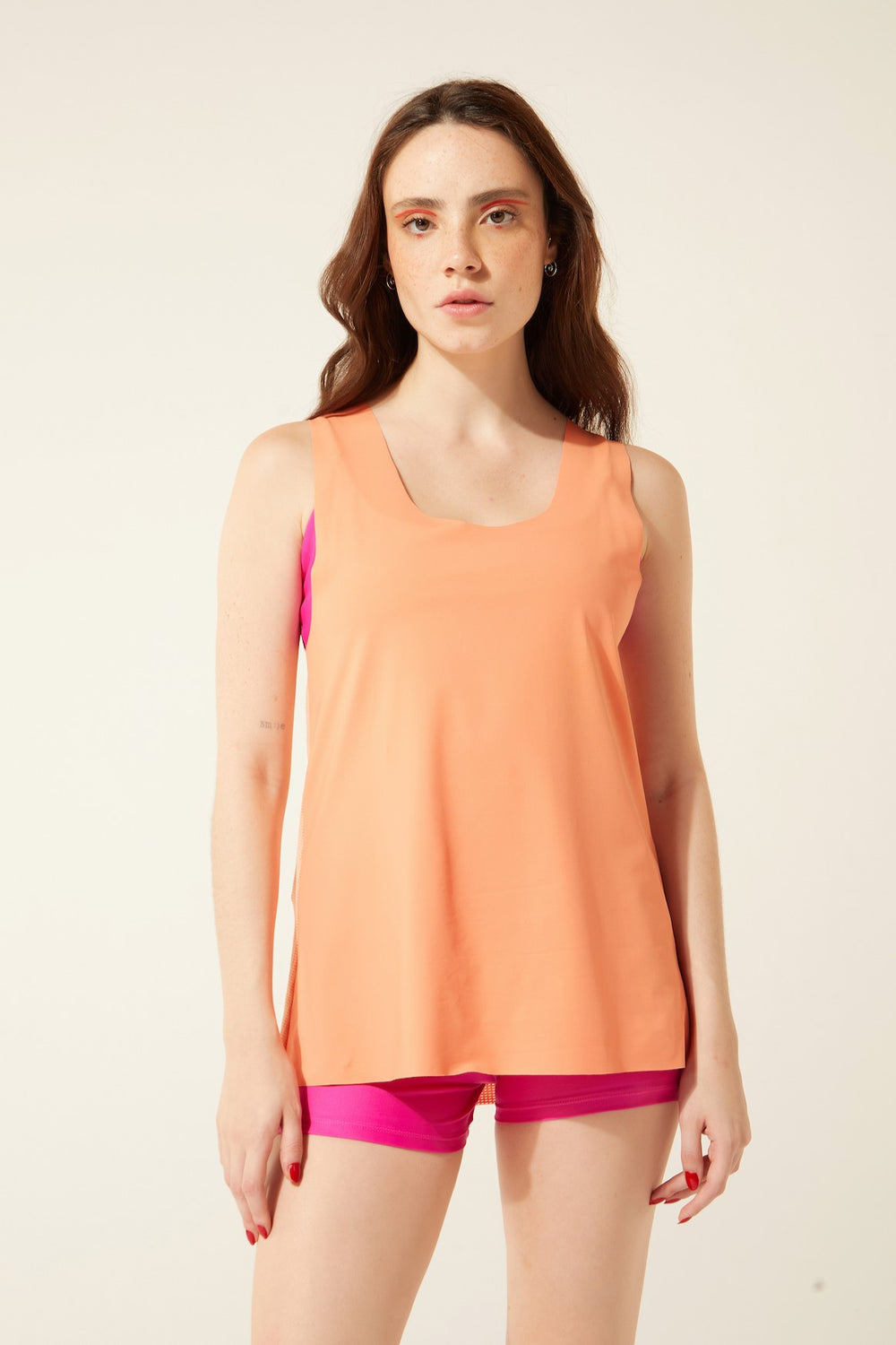 Uma regata do jeito que a gente gosta: livre e leve, com cavas laterais amplas e sem costura também na gola e na barra. Uma delícia na pele! Com duas cores, uma na frente e outra atrás. Tudo bem papaia!