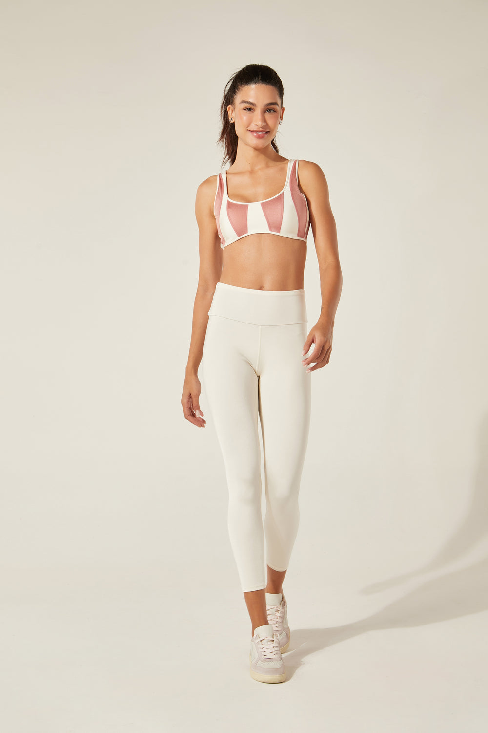 Modo produtivo: UPC (upcycling) com tecido ORICLA ELÁSTICO. Retalhos sobrantes e selecionados de grandes produções da moda fitness são transformados em novos rolos de tecido com costuras tecnológicas que não marcam a pele. Cada criação nasce de um processo intenso que envolve técnica, sensibilidade e muita criatividade! No upcycling, o investimento é humano — está no tempo e na habilidade de quem costura, e não em tecidos novos. ORICLA ELÁSTICO, desenvolvido em parceria entre a Confecções T.Christina e a designer Agustina Comas, foi premiado pelo Fashion Futures 2021 na categoria Inovação e Tecnologia.
