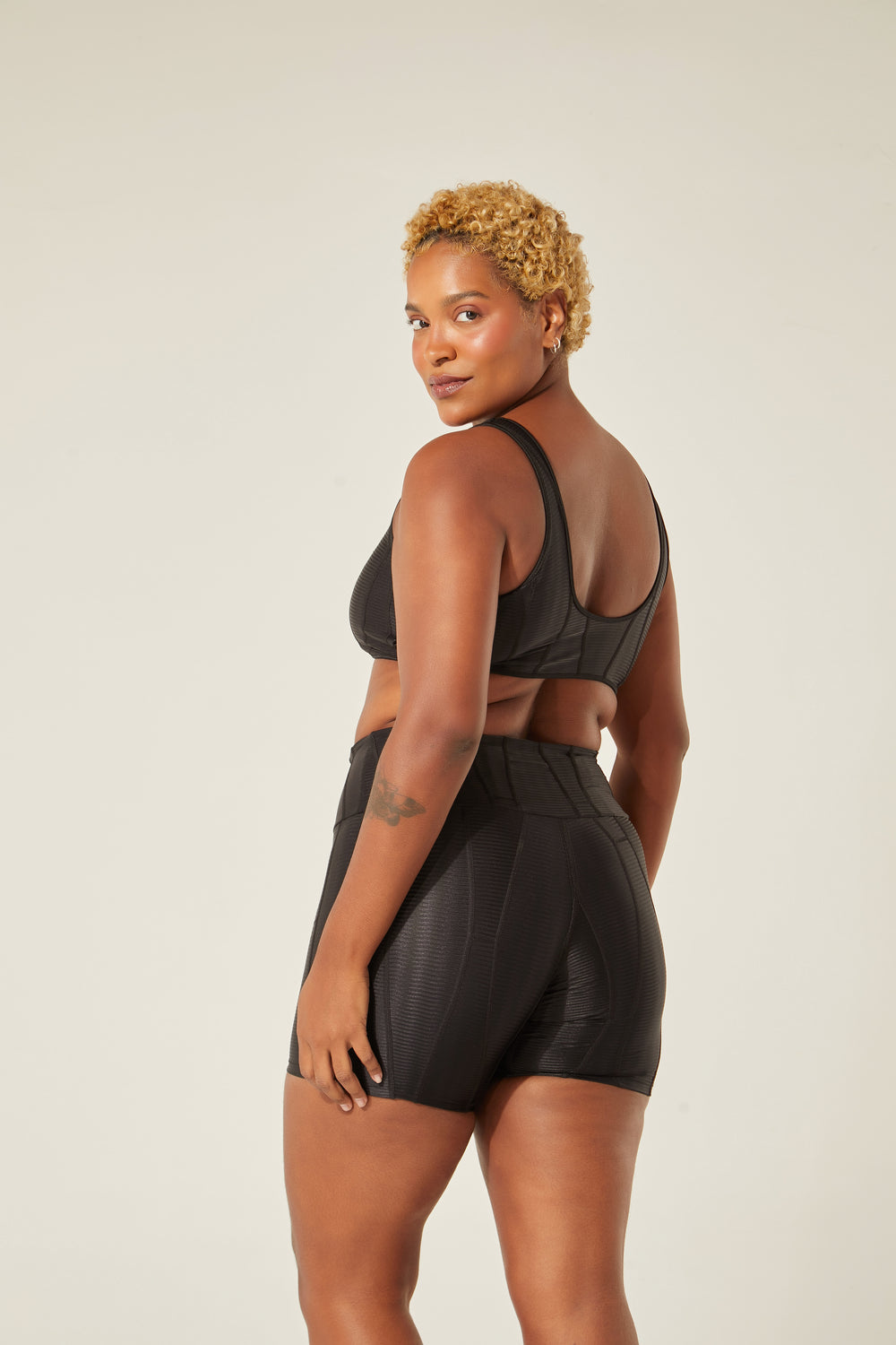 Modo produtivo: UPC (upcycling) com tecido ORICLA ELÁSTICO. Retalhos sobrantes e selecionados de grandes produções da moda fitness são transformados em novos rolos de tecido com costuras tecnológicas que não marcam a pele. Cada criação nasce de um processo intenso que envolve técnica, sensibilidade e muita criatividade! No upcycling, o investimento é humano — está no tempo e na habilidade de quem costura, e não em tecidos novos. ORICLA ELÁSTICO, desenvolvido em parceria entre a Confecções T.Christina e a designer Agustina Comas, foi premiado pelo Fashion Futures 2021 na categoria Inovação e Tecnologia.