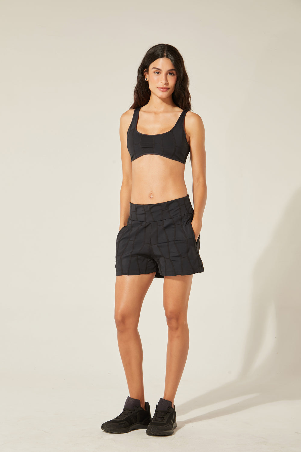 Modo produtivo: UPC (upcycling) com tecido ORICLA ELÁSTICO. Retalhos sobrantes e selecionados de grandes produções da moda fitness são transformados em novos rolos de tecido com costuras tecnológicas que não marcam a pele. Cada criação nasce de um processo intenso que envolve técnica, sensibilidade e muita criatividade! No upcycling, o investimento é humano — está no tempo e na habilidade de quem costura, e não em tecidos novos. ORICLA ELÁSTICO, desenvolvido em parceria entre a Confecções T.Christina e a designer Agustina Comas, foi premiado pelo Fashion Futures 2021 na categoria Inovação e Tecnologia.